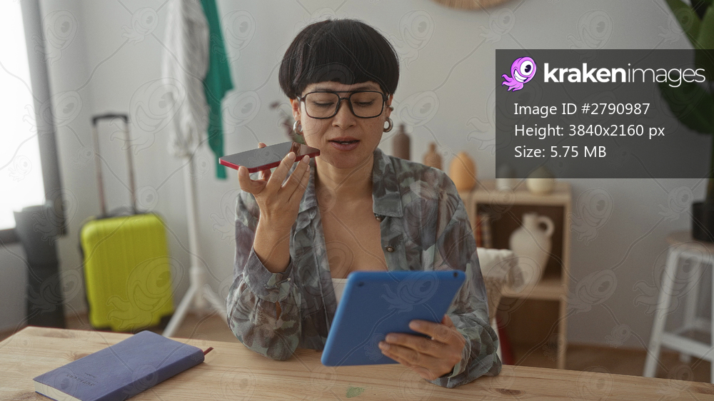Woman speaking on a smartphone while holding a tablet in a cozy indoor apartment setting, surrounded by travel essentials, displaying a relaxed and modern lifestyle. - Kraken Images
