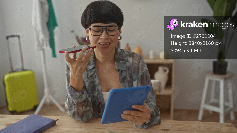 Woman speaking on a smartphone while holding a tablet in a cozy indoor apartment setting, surrounded by travel essentials, displaying a relaxed and modern lifestyle. - Kraken Images