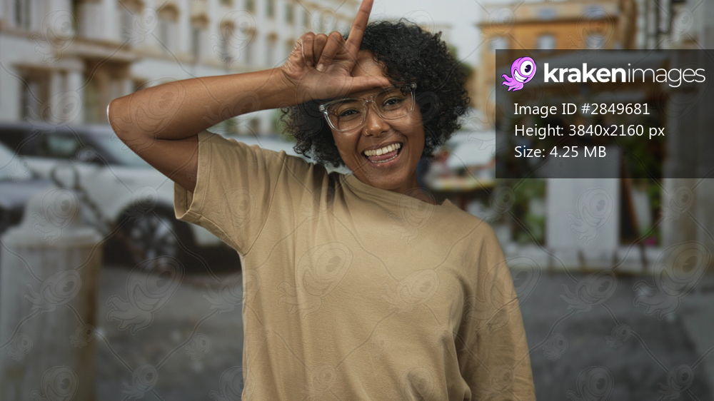 Woman spread arm on street with beige shirt and glasses; teasing fun.
