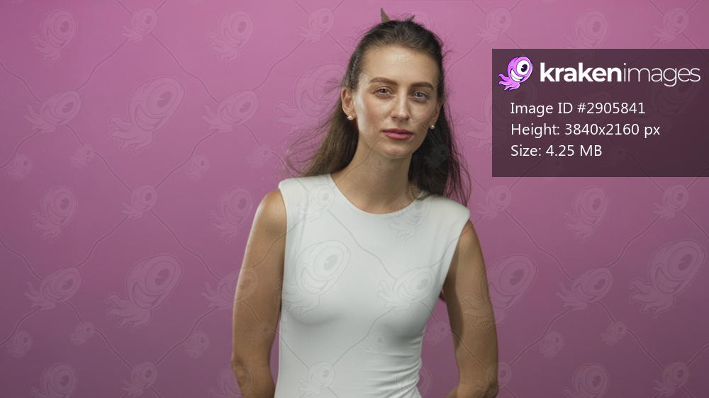 Woman squinting and tilting her head slightly, shoulders exposed, wearing a white sleeveless shirt against a pink studio wall; skepticism introspection tension. - Kraken Images