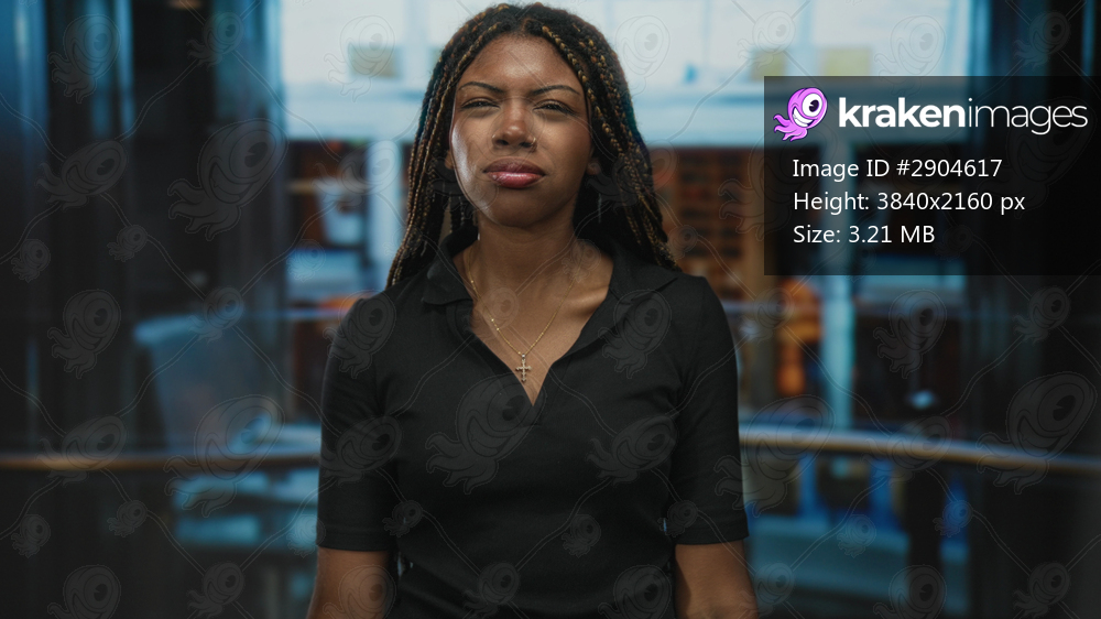 Woman squints eyes and presses lips, wearing a cross necklace and braided hair and a black collared shirt in cruise ship building interior; seasick discomfort. - Kraken Images