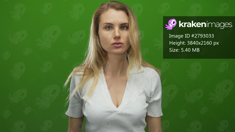 Woman standing against a vibrant green background, with long blonde hair and a focused gaze, wearing a white shirt, suggesting isolation and contemplative mood. - Kraken Images