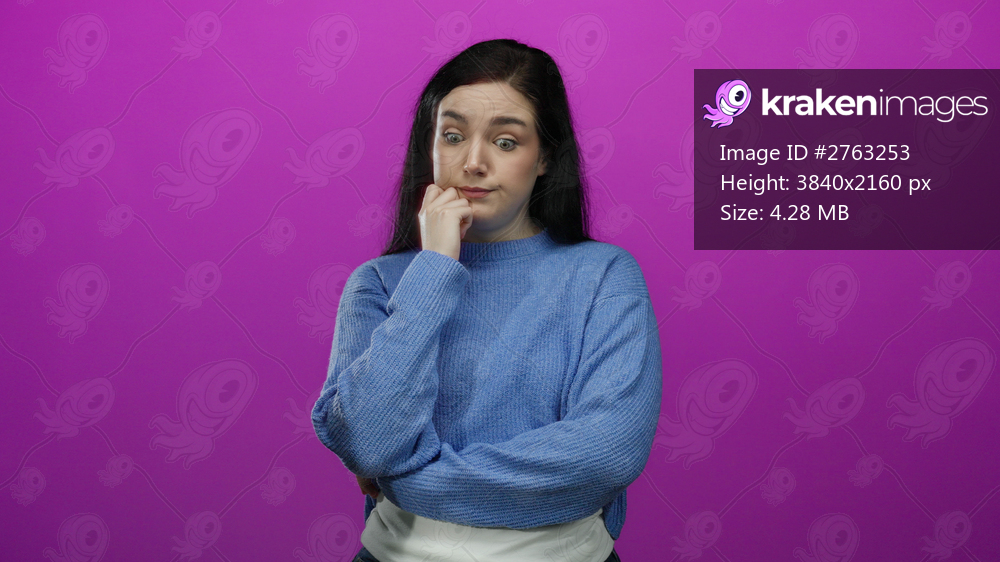 Woman standing against a vibrant pink background, wearing a blue sweater, with brunette hair, expressing contemplation with crossed arms and thoughtful look. - Kraken Images