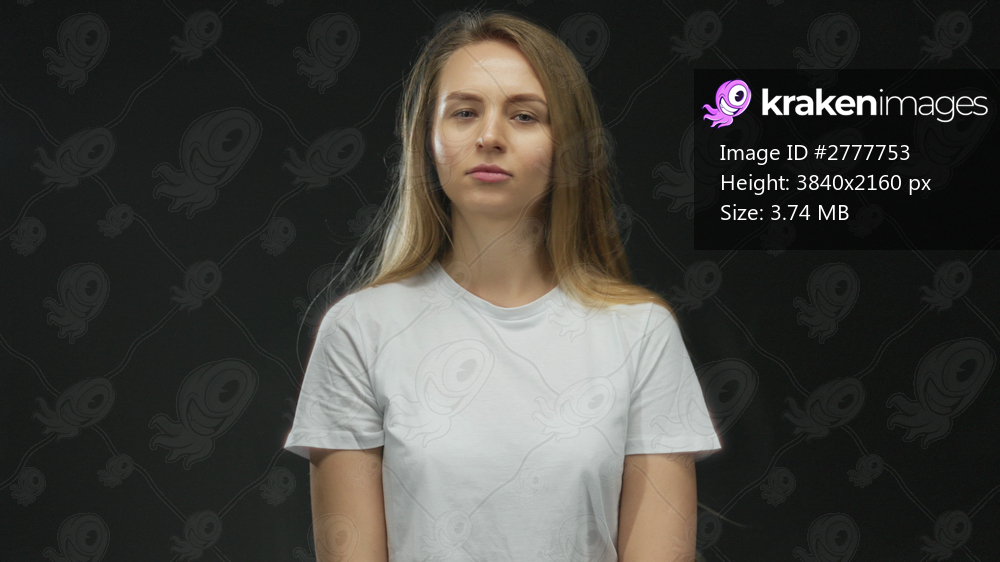 Woman standing against isolated black background, arms crossed, in a white shirt with a serious expression, young, caucasian, expressing confidence and determination. - Kraken Images