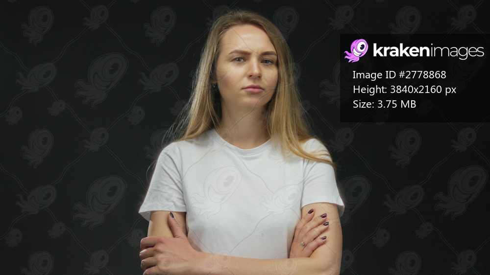 Woman standing against isolated black background, arms crossed, in a white shirt with a serious expression, young, caucasian, expressing confidence and determination. - Kraken Images