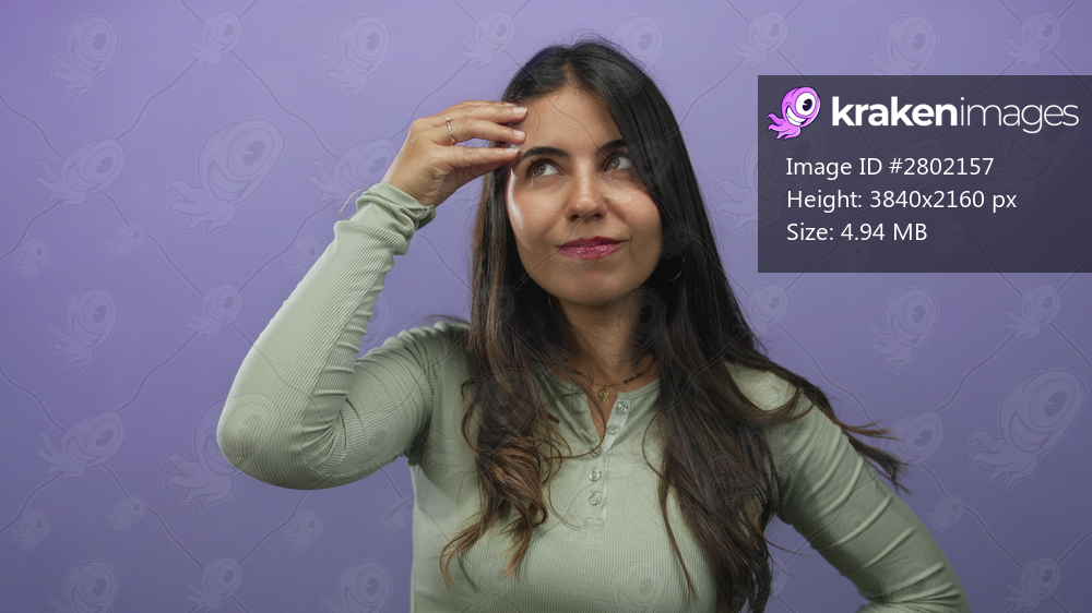 Woman standing against purple background looks thoughtful while touching her forehead, expressing contemplation and introspection with a slight smile.