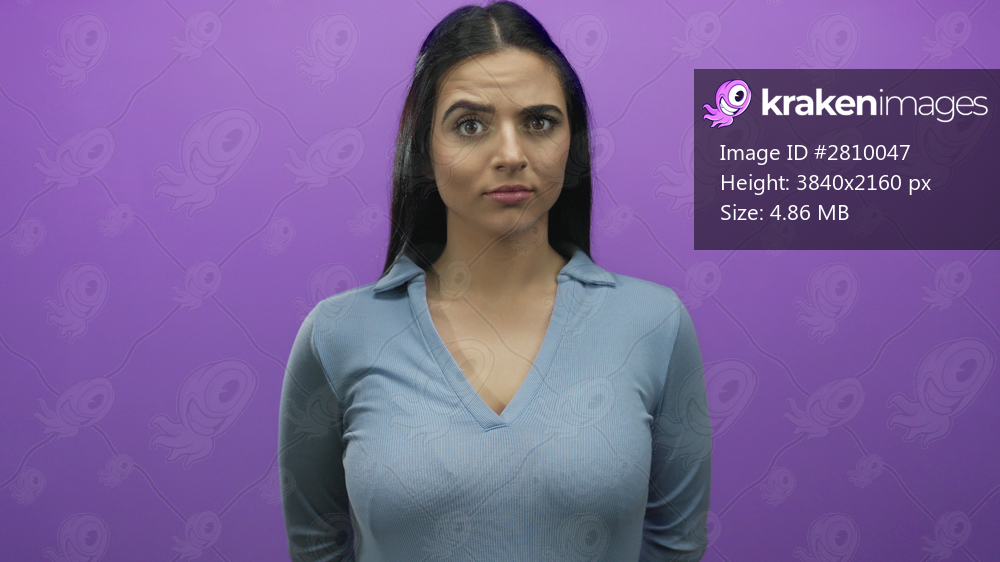 Woman standing against purple wall with a surprised expression, wearing a blue shirt, looking directly at the camera, young and confident, isolated, indoors, expressive, vivid colors. - Kraken Images