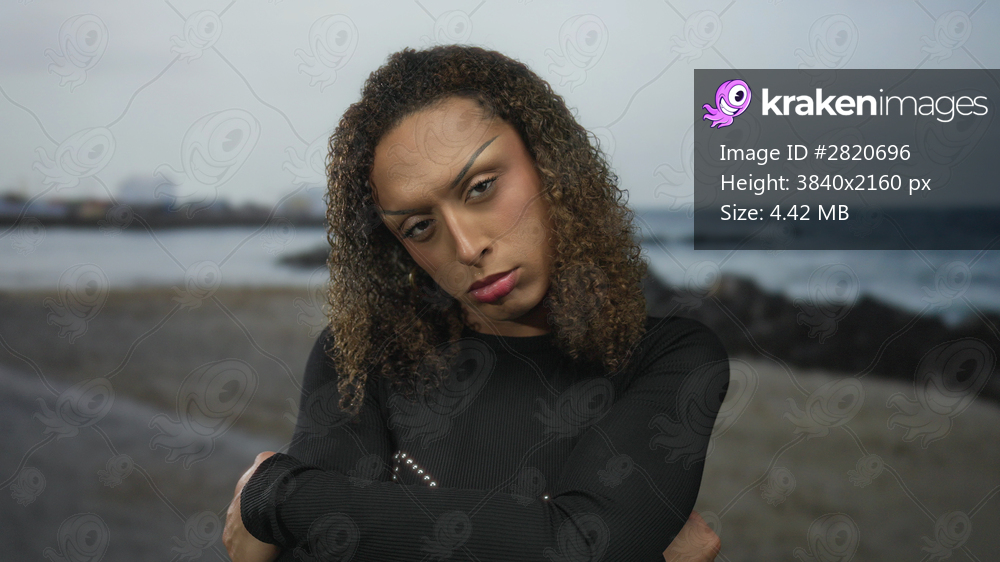 Woman standing with arms crossed hugging her shoulders on beach shore near rocky coast by calm sea; rejection.