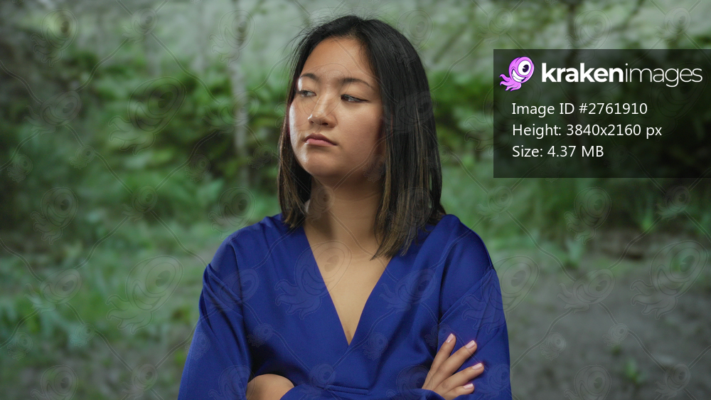 Woman standing with arms crossed in a park wearing blue blouse, expressing confidence in a natural outdoor setting with blurred green foliage around, looking contemplative and serene. - Kraken Images