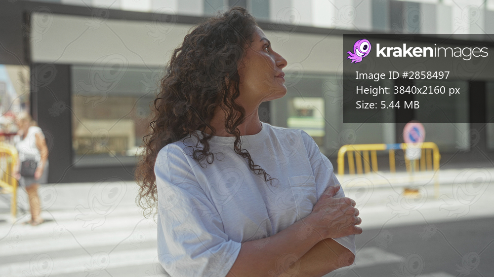 Woman standing with arms crossed in front of modern building on urban street; confidence and resolve.