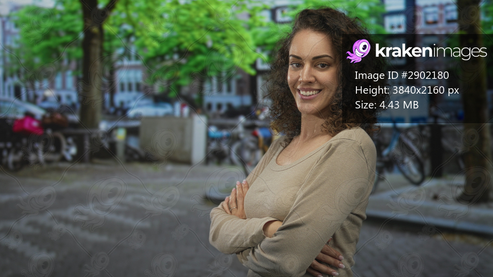 Woman standing with arms crossed smiling on a city street with bicycles and trees visible; confidence community connection.