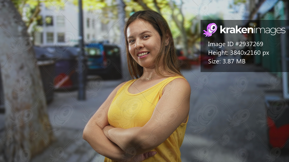 Woman standing with arms crossed and smiling on a city street wearing a yellow tanktop and necklace; confidence empowerment success.