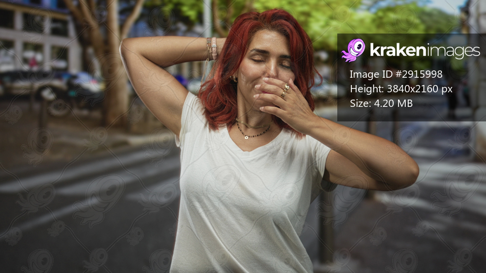 Woman standing with arms raised, eyes closed and hand behind head on a city street crosswalk lined with trees and bollards; calm relaxation moment.