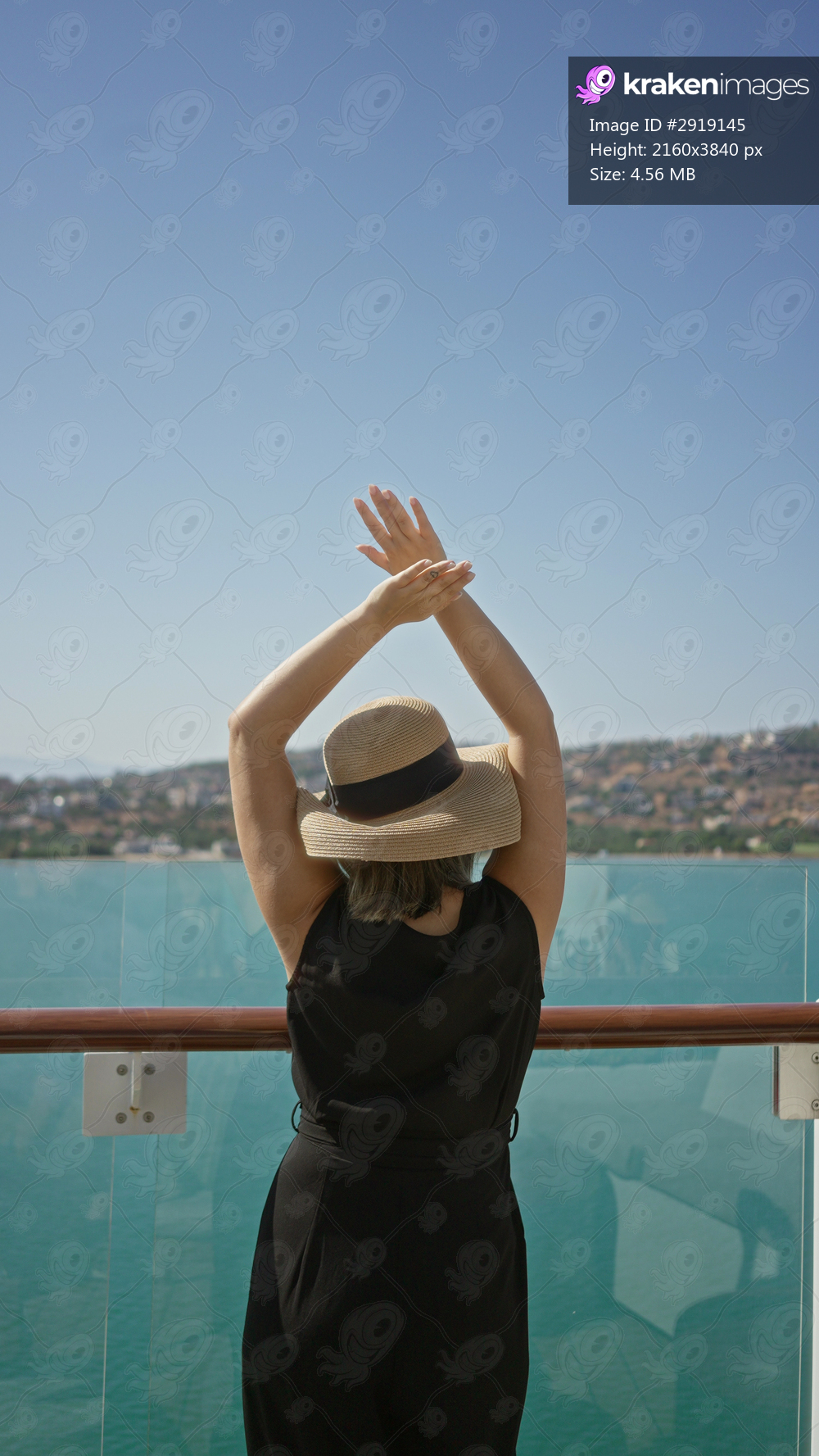 Woman standing with arms raised on cruise deck railing wearing straw hat and black dress, sea and distant town visible; serenity.
