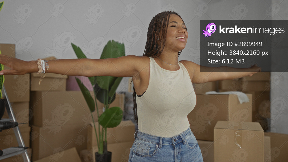 Woman standing with arms spread among stacked moving boxes, houseplant and tape sealed cartons in building, wearing tank top and jeans; new home joy.