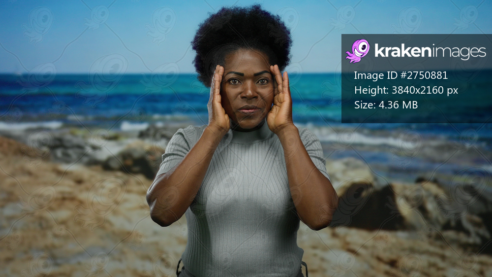 Woman standing at a picturesque seaside beach, hands framing her face with a thoughtful expression, surrounded by ocean waves and clear sky, capturing serenity and contemplation. - Kraken Images