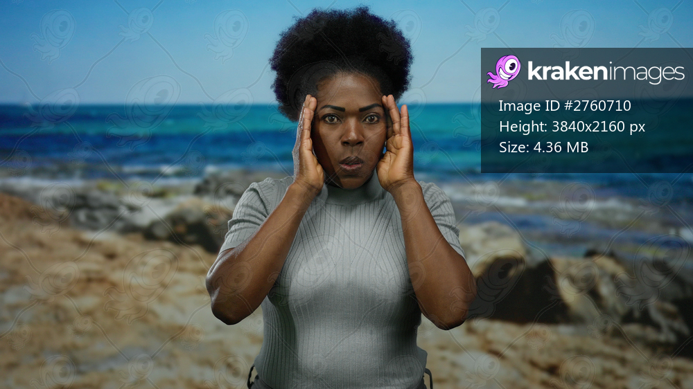 Woman standing at a picturesque seaside beach, hands framing her face with a thoughtful expression, surrounded by ocean waves and clear sky, capturing serenity and contemplation. - Kraken Images