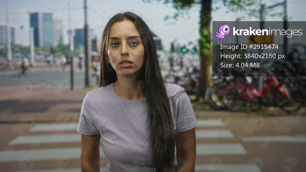 Woman standing at street crosswalk with visible face acne and long hair, looking down amid parked bicycles and city buildings; pensive solitude.