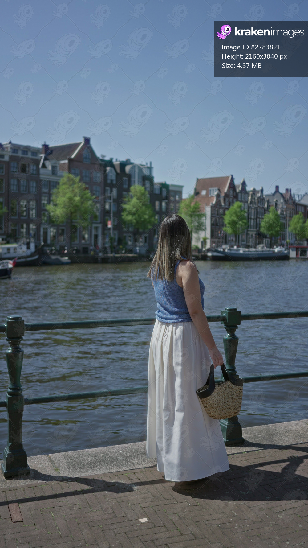 Woman standing by amsterdam canal admiring view of historic buildings and water on sunny day holding straw bag peaceful moment outdoors