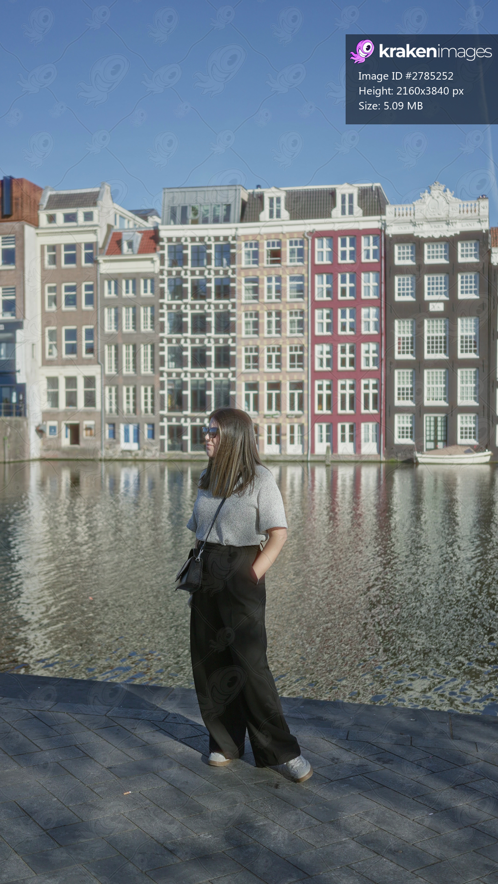 Woman standing by amsterdam canal with colorful buildings reflecting in water on a sunny day, brunette adult enjoying outdoor urban scene with modern architecture. - Kraken Images