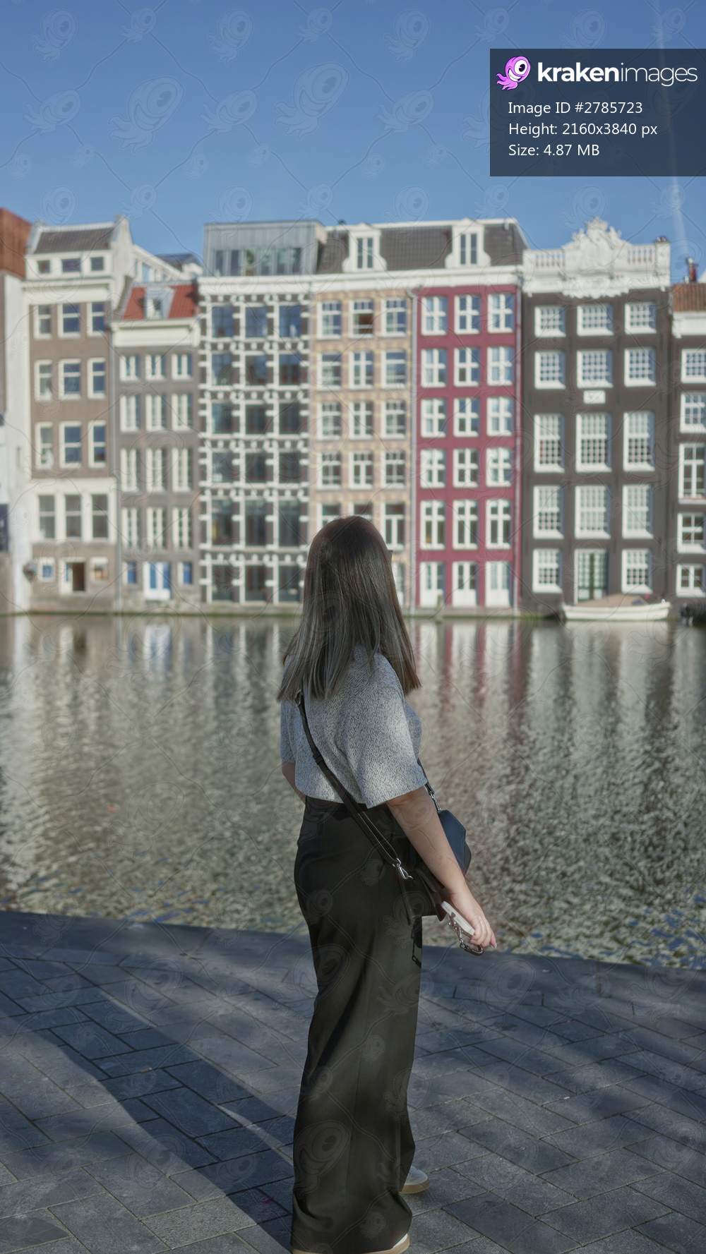 Woman standing by amsterdam canal with colorful buildings reflecting in water on a sunny day, brunette adult enjoying outdoor urban scene with modern architecture. - Kraken Images