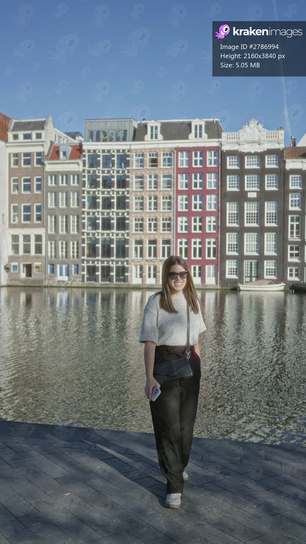 Woman standing by amsterdam canal with colorful buildings reflecting in water on a sunny day, brunette adult enjoying outdoor urban scene with modern architecture. - Kraken Images