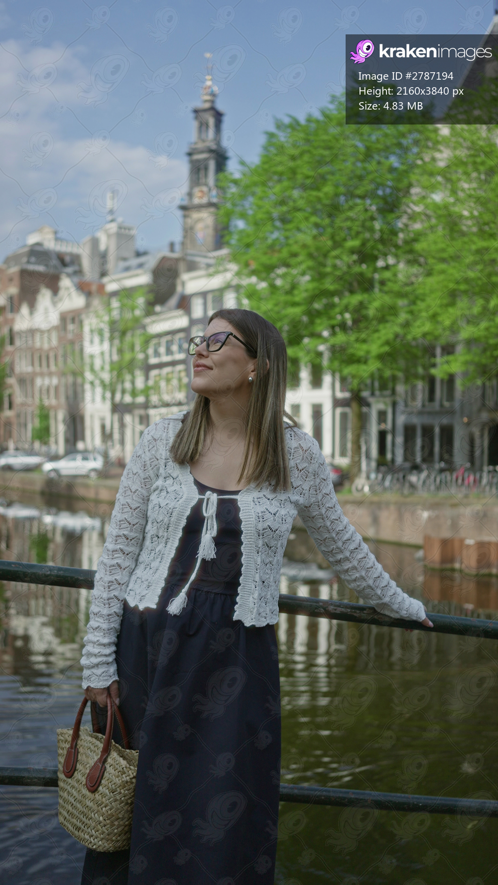 Woman standing by amsterdam canals with greenery, wearing glasses and a white sweater, showcasing the picturesque urban scenery on a sunny day.