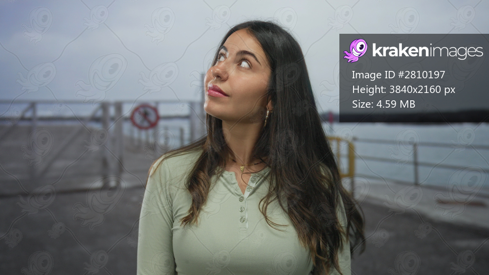 Woman standing by seaside promenade outdoors, looking thoughtful at the ocean, with a peaceful cloudy sky in the background.