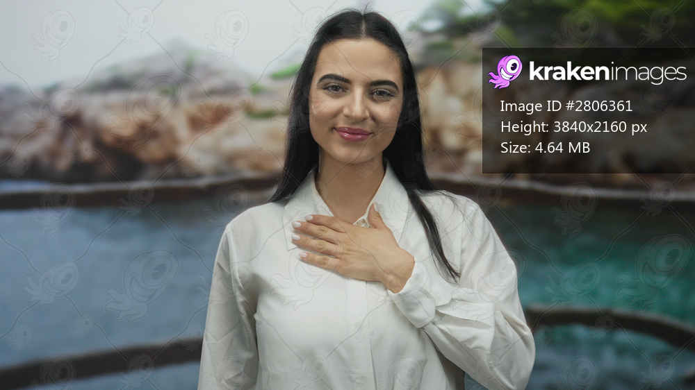 Woman standing by the seaside with a hand on her heart, exuding confidence against a backdrop of rocky cliffs and a calm ocean, embracing the outdoor atmosphere. - Kraken Images