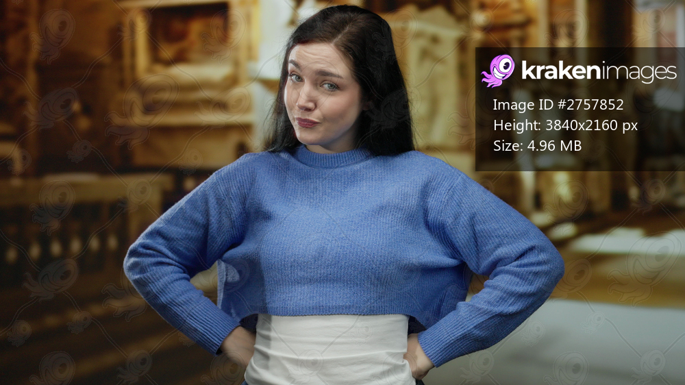 Woman standing confidently in a catholic church setting with brunette hair and blue sweater, radiating beauty and elegance amidst religious architecture. - Kraken Images