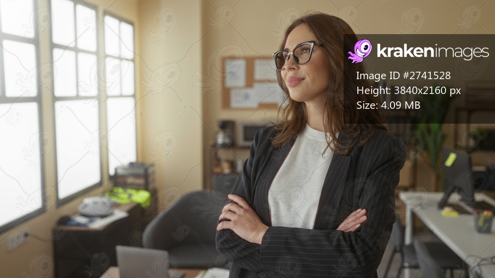Woman standing confidently in a modern office with arms crossed, wearing glasses and a suit, highlighting a professional ambiance with large windows, desks, and office decor. - Kraken Images