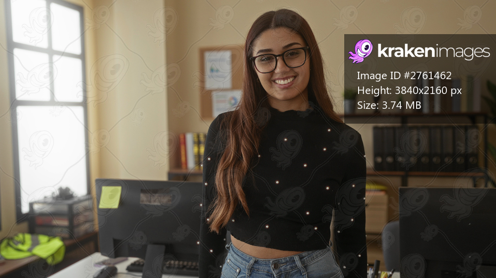 Woman standing confidently in a modern office environment with glasses and long hair, embodying professionalism and focus in an indoor work setting with natural light. - Kraken Images