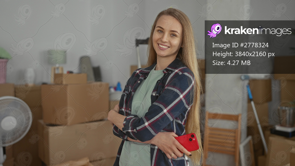 Woman standing confidently in new home surrounded by boxes and unpacked items, smartphone in hand, embodying the excitement of a fresh start in a bright indoor setting. - Kraken Images