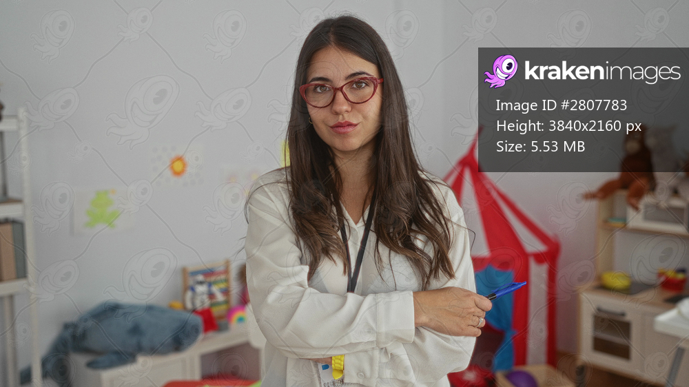 Woman standing confidently indoors in a colorful kindergarten classroom holding pen, surrounded by playful educational toys and artwork, showcasing nurturing preschool teacher environment.