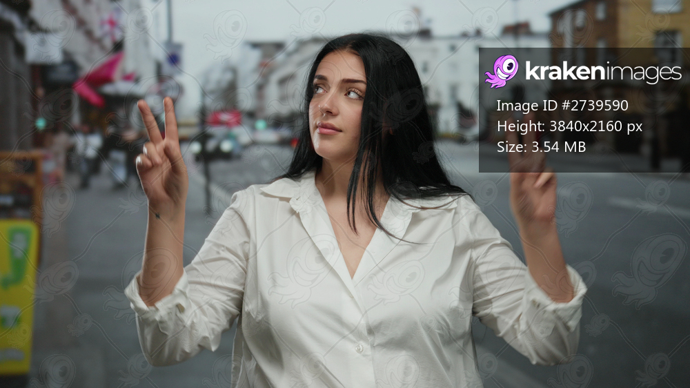 Woman standing confidently on a bustling city street, emanating confidence as cars and people navigate the urban environment around her.
