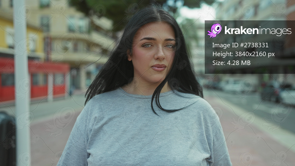 Woman standing confidently on a city street with long hair flowing in the wind, showcasing a casual style in an urban outdoor setting.
