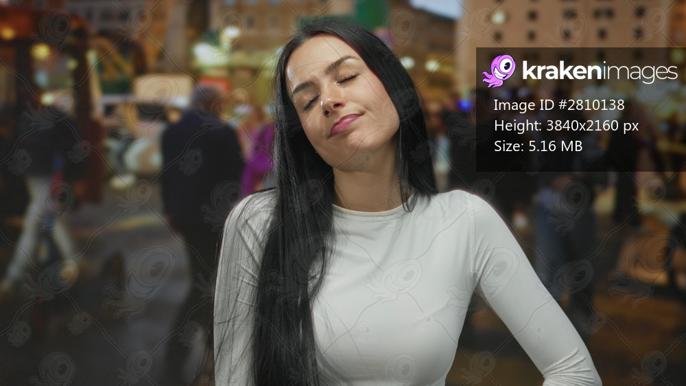 Woman standing confidently on busy city street at night surrounded by blurred crowd capturing urban lifestyle and vibrancy with closed eyes and serene expression - Kraken Images