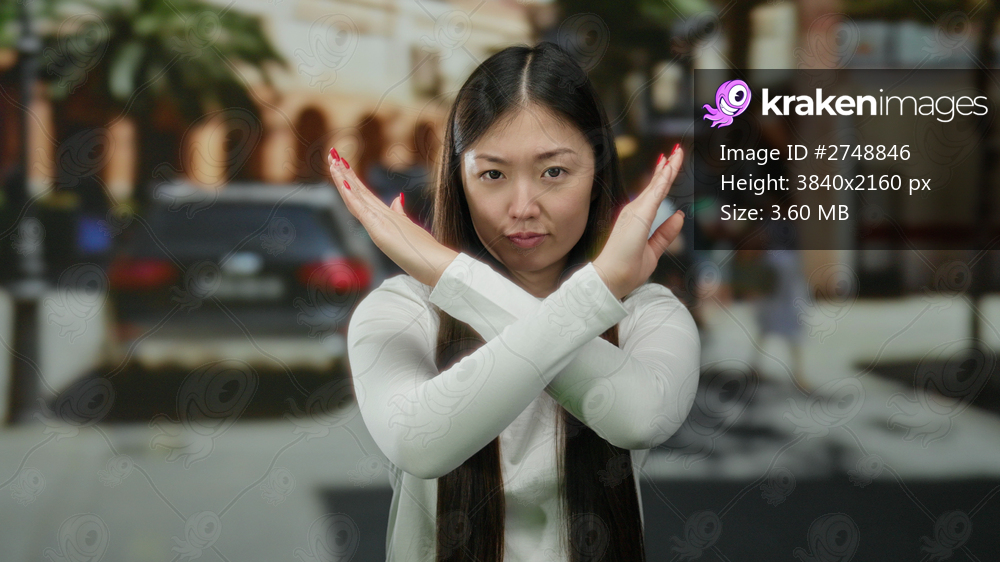 Woman standing confidently outdoors in a city street, expressing disapproval with urban background and cars, wearing casual attire, reflecting modern urban lifestyle. - Kraken Images
