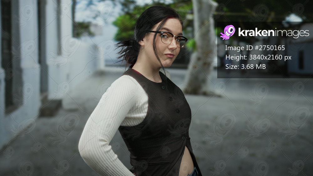 Woman standing confidently outdoors on a street with concrete buildings and sunny weather, wearing glasses and casual attire, surrounded by a serene urban atmosphere. - Kraken Images