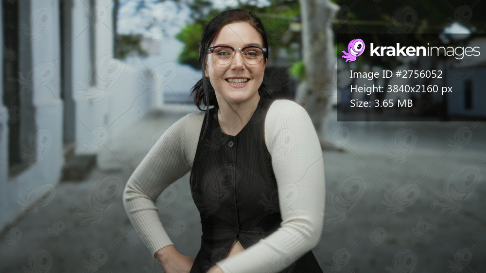 Woman standing confidently outdoors on a street with concrete buildings and sunny weather, wearing glasses and casual attire, surrounded by a serene urban atmosphere. - Kraken Images