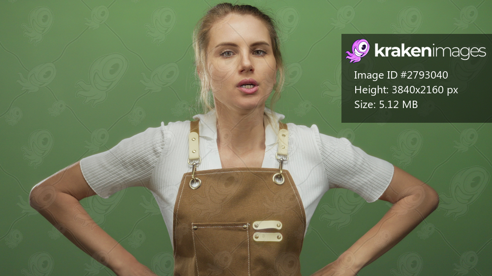 Woman standing confidently wearing apron against solid green background, appearing thoughtful and engaged.