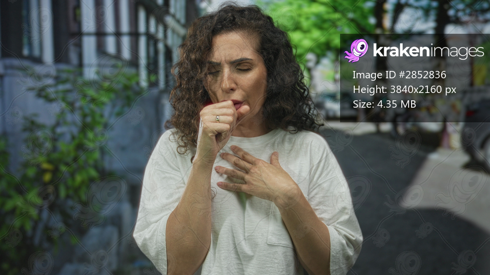 Woman standing coughs into hand and holds chest on bustling city street at midday; respiratory discomfort.