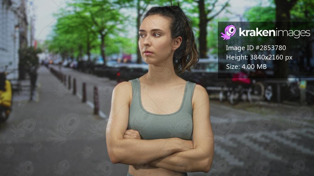 Woman standing with crossed arms and a serious expression on a city street lined with cars; rejection.