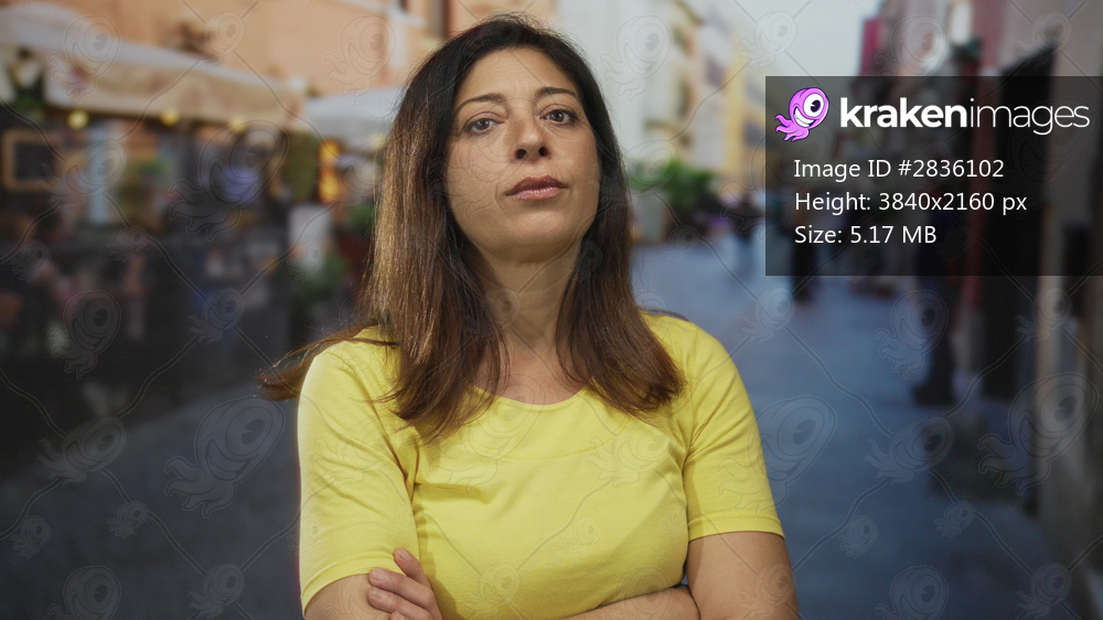 Woman standing with crossed arms in crowded street scene with blurred pedestrians; denial rejection.