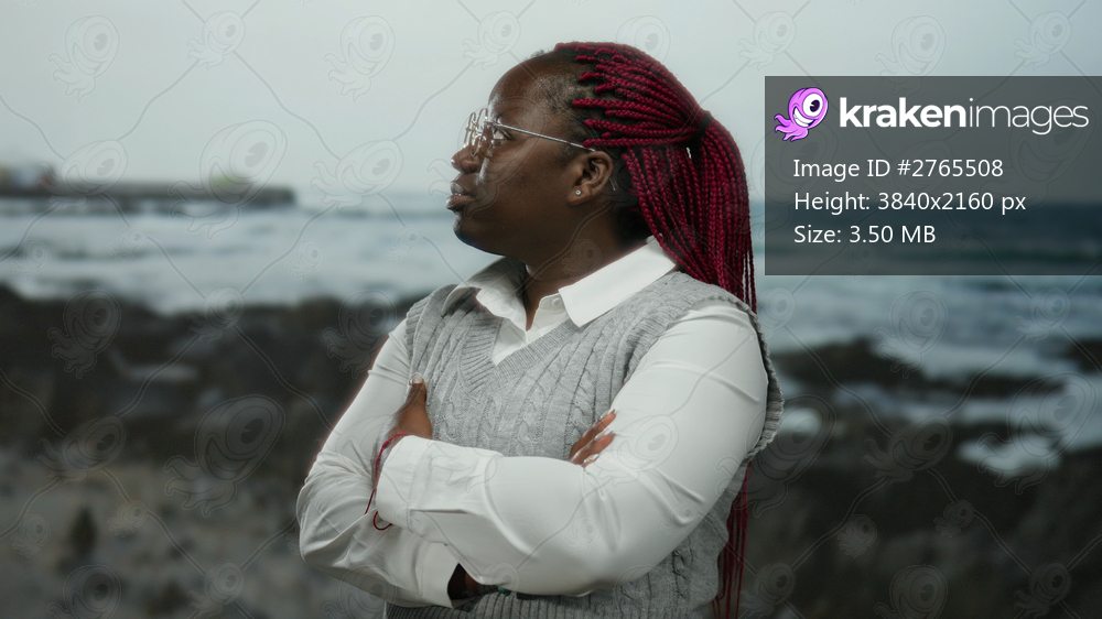 Woman standing with crossed arms on a seaside beach with visible waves ocean and sky emphasizing her braided hair confident pose and serene outdoor environment. - Kraken Images