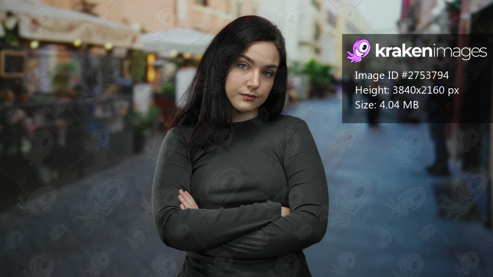 Woman standing with crossed arms on bustling street showcasing urban life with casual confidence and brunette hair.