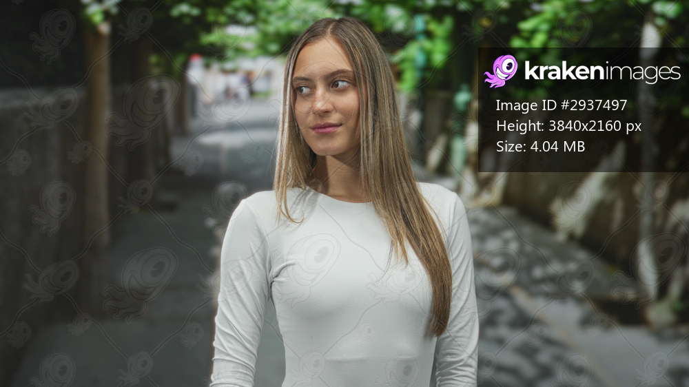 Woman standing with direct gaze on a tree lined street wearing a white long sleeve shirt and loose hair; confidence.