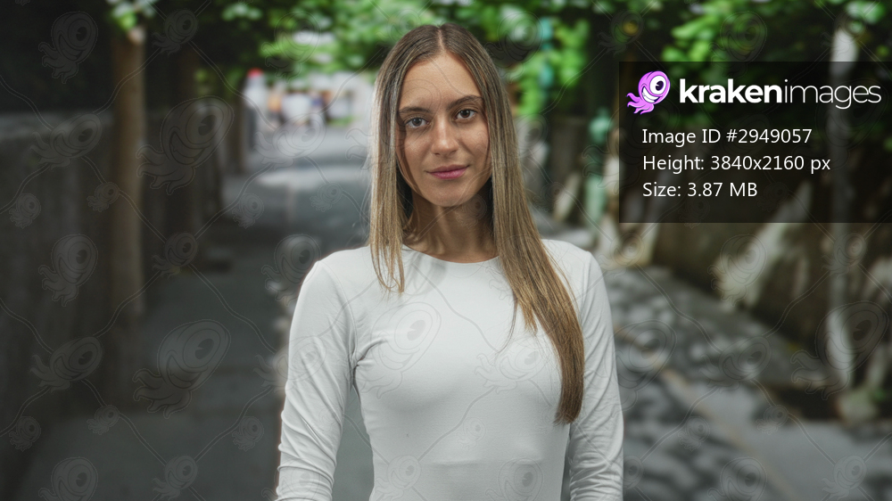 Woman standing with direct gaze on a tree lined street wearing a white long sleeve shirt and loose hair; confidence.