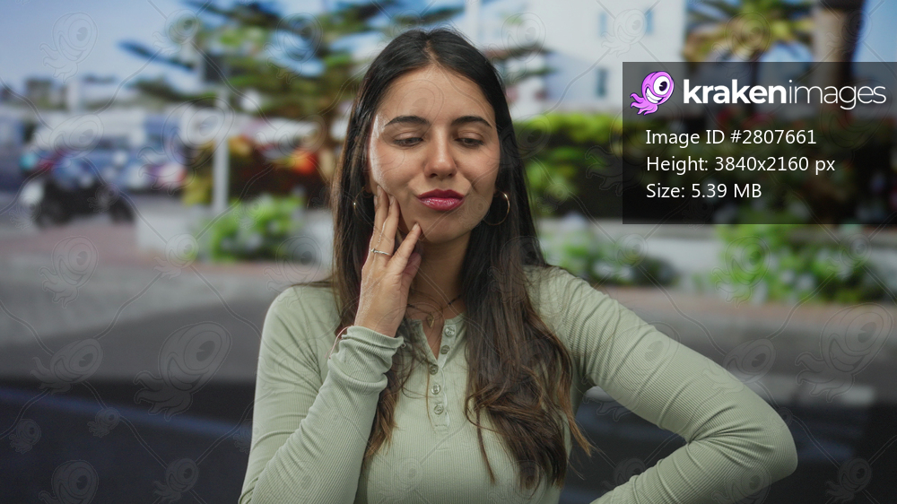 Woman standing with eyes closed on urban street wearing green shirt and hoop earrings, appearing thoughtful on a sunny day outdoors with blurred city background. - Kraken Images