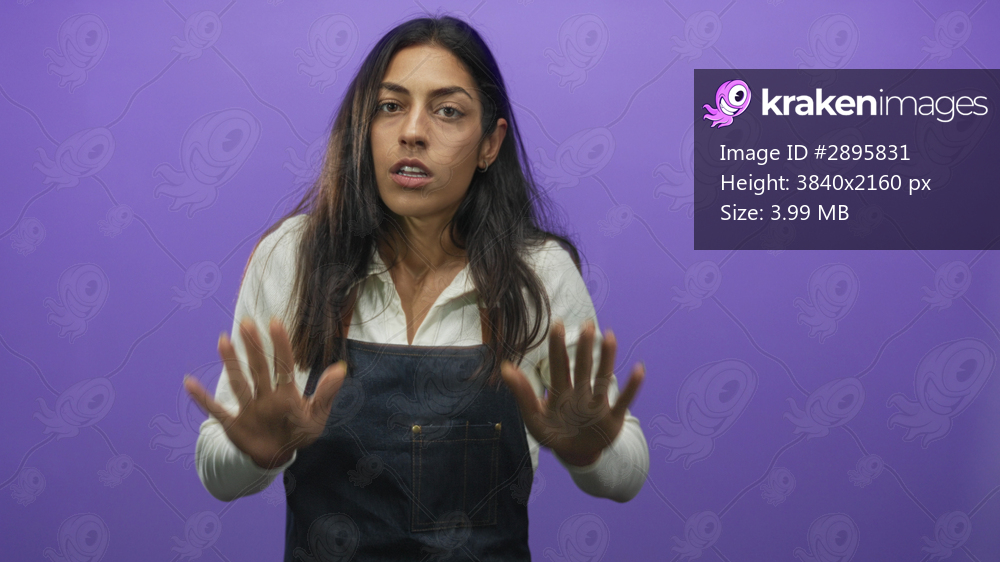 Woman standing facing camera with hands raised palms out, wearing denim apron and white shirt in studio with solid purple wall; caution pause.